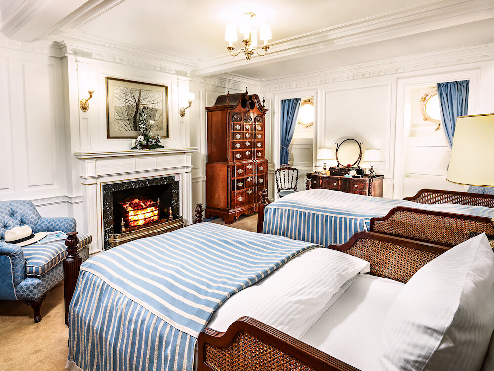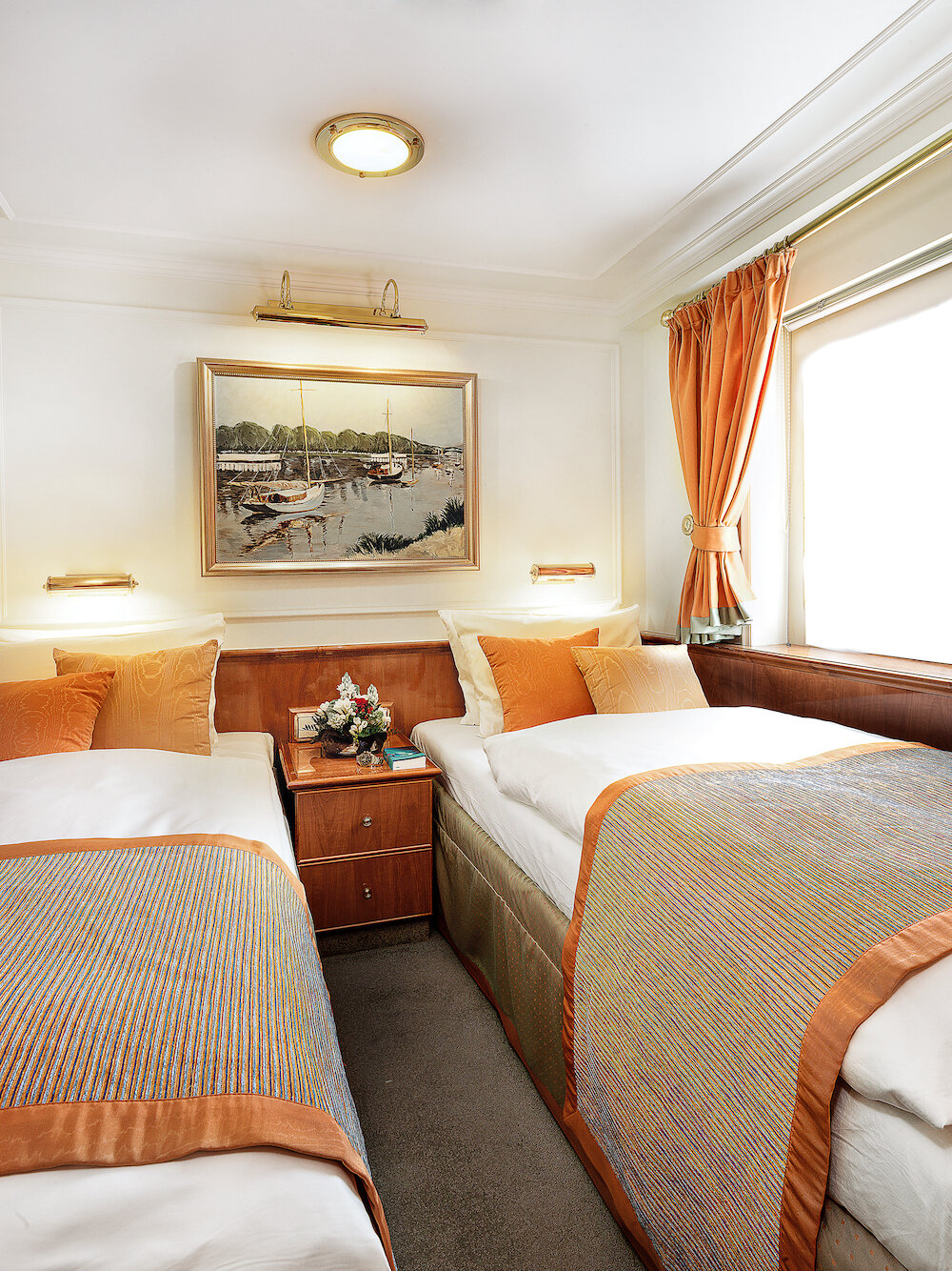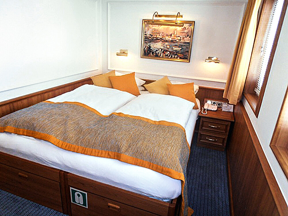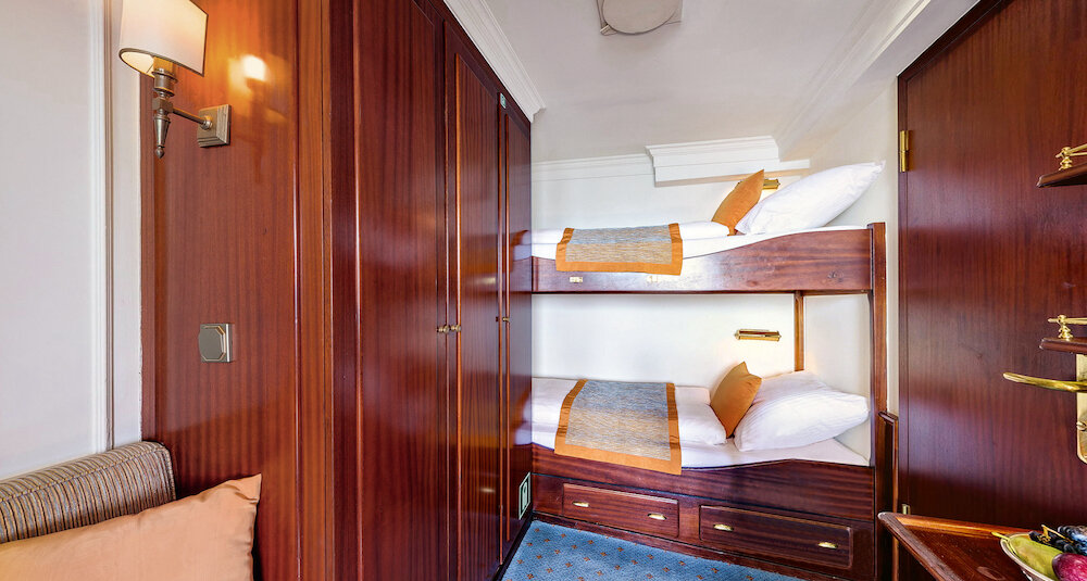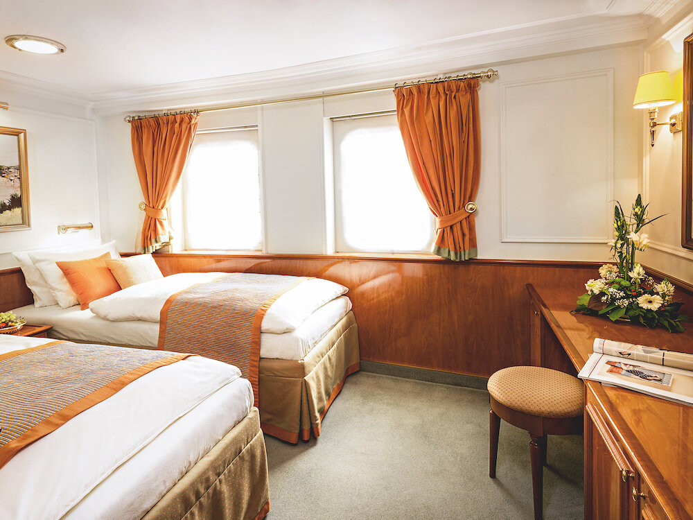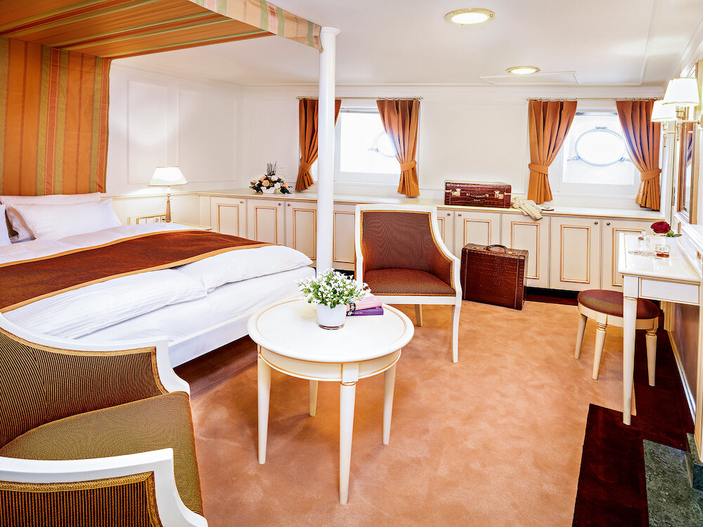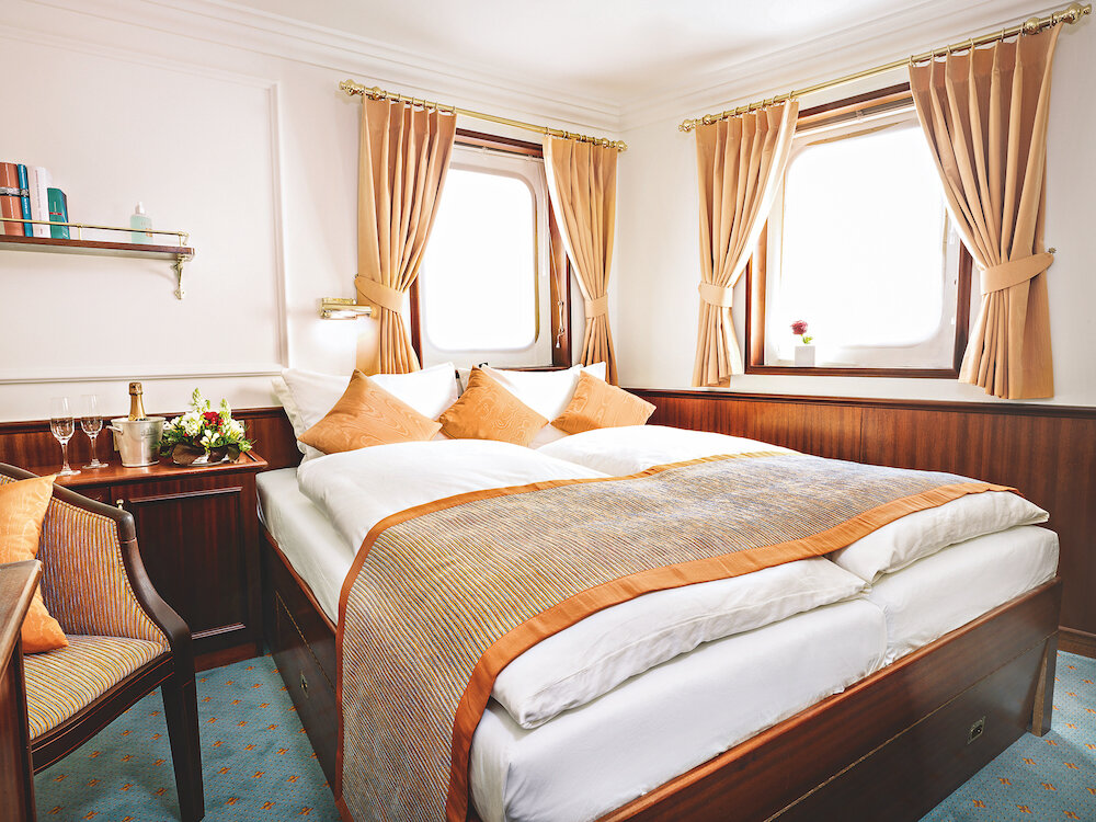 Ein ganz privates Ambiente vermitteln die nur 32 Außenkabinen. Stilvoll und gemütlich eingerichtet verzaubern alle Kabinen mit einem eigenen Charme. Unvergleichlich sind die zehn Originalkabinen auf dem Hauptdeck mit Marmorbad und goldenen Wasserhähnen.